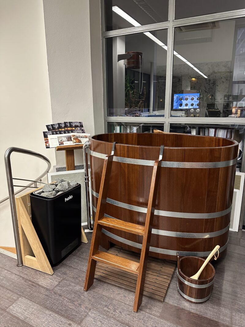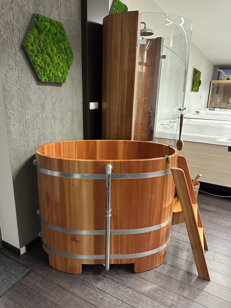 Kompaktní ochlazovací káď z výběrového dřeva, ideální ke sauně nebo jako součást domácí wellness zóny. Stabilní, pevná a připravena k okamžitému použití.