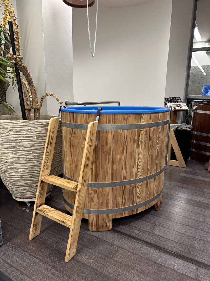 Ochlazovací a koupací káď ze smrkového dřeva bez povrchové úpravy, uvnitř se sanitární PP vložkou odolnou proti UV záření. Na tyto ochlazovny se používá výběrové smrkové dřevo z poničených lesů.
